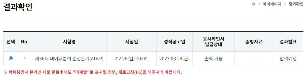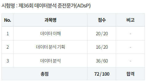 Adsp는 공식 성적공고일 일주일 전에 시험점수를 미리 알려주고, 일주일 동안 이의신청을 받는다.
